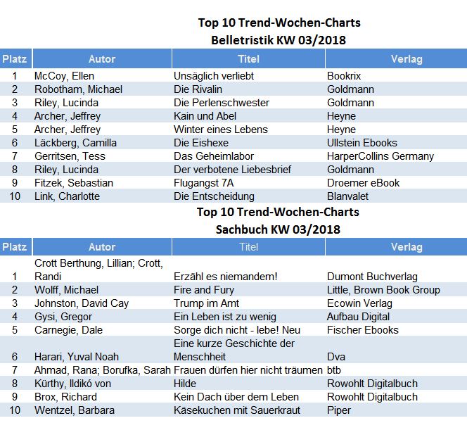 Die Top 10 ebook Trend Charts in Belletristik und Sachbuch werden wöchentlich durch media control GmbH ermittelt und in den eBook-Shops zur Verfügung gestellt: