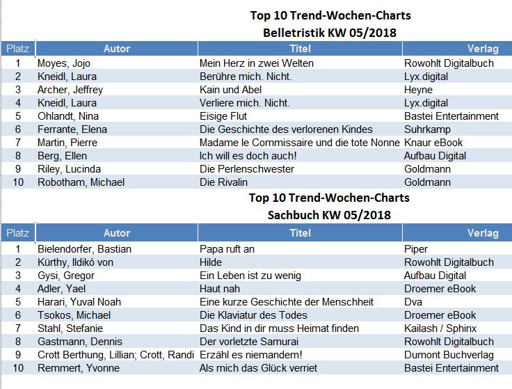 Die Top 10 ebook Trend Charts in Belletristik und Sachbuch werden wöchentlich durch media control GmbH ermittelt und in den eBook-Shops zur Verfügung gestellt: