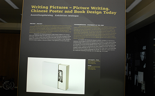 Mit dem höchsten Prädikat „Gold“ in der Unterkategorie Bücher und Kalender wurde Schriftbilder – Bilderschrift. Chinesisches Plakat- und Buchdesign geehrt. Es handelt sich dabei um einen ungewöhnlichen Katalog für eine zeitgenössische chinesische Grafikdesignausstellung. In der Beschreibung heißt es: „Gedruckt in Sonderfarben und hauptsächlich handgefertigt, zeigt das Buch nicht nur die Reife der zeitgenössischen chinesischen Buchgestaltung und Drucktechniken, sondern beabsichtigt auch, das moderne Publikum in der Ära der E-Books an die Bedeutung von handgemachten Büchern zu erinnern.“ Entworfen hat den Katalog Hesign International, Berlin.