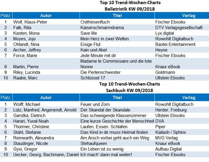 Die Top 10 ebook Trend Charts in Belletristik und Sachbuch werden wöchentlich durch media control GmbH ermittelt und in den eBook-Shops zur Verfügung gestellt: