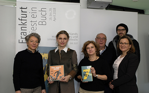 Constanze Neumann, seit 1. Dezember 2017 Verlagsleiterin Literatur beim Aufbau Verlag, beachtete die Entwicklung von Frankfurt liest ein Buch seit 2010 – damals stand Valentin Sengers Kaiserhofstraße 12 im Mittelpunkt des ersten Festivals. Der Aufbau Verlag freue sich, das diesjährige Buch zu liefern, außerdem die erstmals auf Deutsch erschienene Grafic-Novel-Ausgabe mit den Originalzeichnungen von William Sharp alias Leon Schleifer aus dem Jahr 1942. „Anna Seghers zeichnete im Roman das Bild der Diktatur, in der jeder Einzelne Haltung zeigen muss. Sie bildete den Querschnitt der Gesellschaft ab“, urteilte Neumann. Seghers sei von Alessandro Manzonis Roman Promessi Sposi (Die Brautleute), 1827, inspiriert worden. „Mich beeindruckte beim Siebten Kreuz der positive Grundton“, sagte Neumann. Das Buch sei unter schwierigen Umständen geschrieben worden, in Kaffeehäusern und an öffentlichen Orten von Mai 1938 bis zum Spätsommer 1939 im französischen Exil. Am Ende gibt es vier Exemplare des Manuskripts, nur eines schafft es in die USA und wird im Bostoner Verlag Little, Brown 1942 veröffentlicht. Aber der Verlag behält den Vorschuss erst einmal ein und will damit einen guten Übersetzer bezahlen.