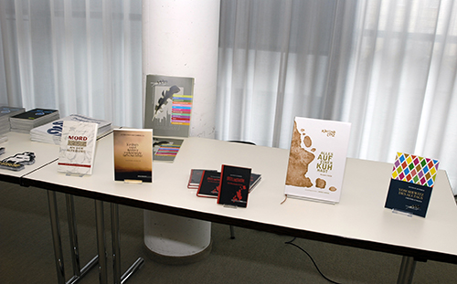 „An der fünften Auflage des Wettbewerbs Schaufensters Hessen beteiligen sich zwei Verlage mehr“, bemerkte Mit-Organisatorin Annette Sievers, Peter Meyer Verlag, und stellte die Kollegen aus den Editionshäusern vor: Sewastos Sampsounis vom Größenwahn Verlag; Karina Lotz von der Edition Federleicht; Axel Dielmann vom gleichnamigen Verlag, Christina Henrich-Kalveram von Henrich Editionen; Luca Müller vom Lauinger Verlag; Lisa Helmholz vom Societäts Verlag und Simon Marshall vom Verlagshaus Römerweg.