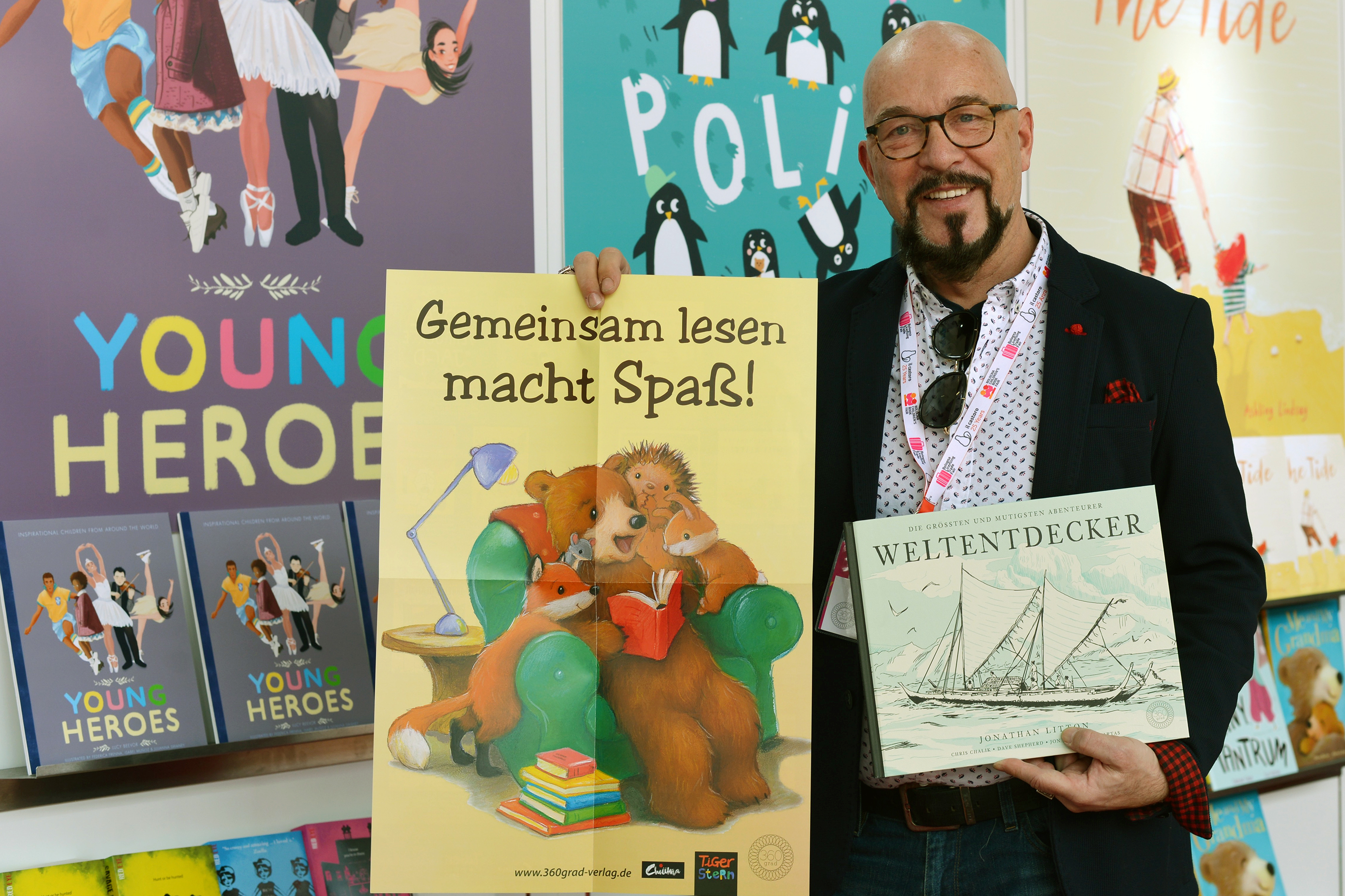 Mit seinem neu gestarteten 360 Grad Verlag möchte Harald Kiesel bis Jahresende etwa 60 Titel lieferbar haben. Ein Großteil davon sind Lizenzen aus dem Little Tiger Verlag, für den Herbst sind aber auch Eigenproduktionen geplant, wie ein Bilderbuch von Michael Engler und Henning Löhlein. Im Sachbuch wird Der Mond ein Highlight, eine facettenreiche Betrachtung des Mondes von Hannah Pang und Thomas Hegbrook.