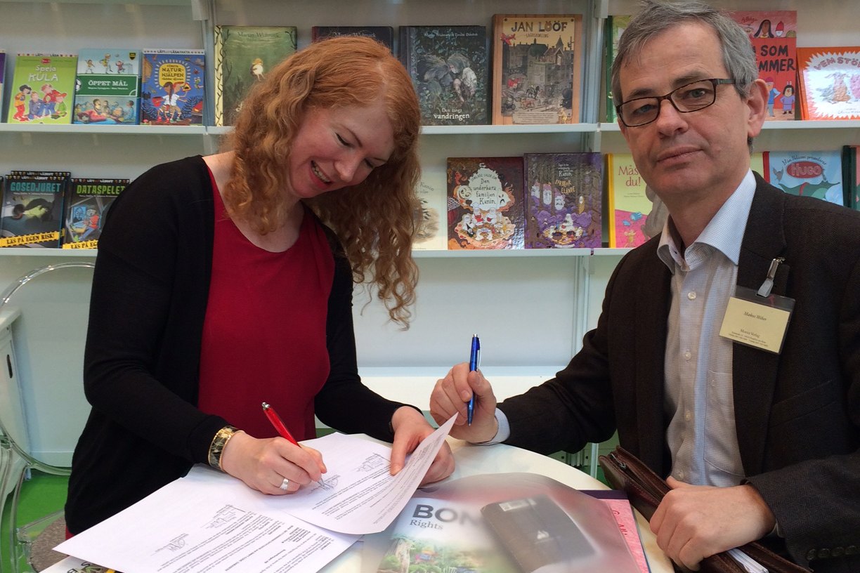 Moritz-Verleger Markus Weber pflegt seine Reihe der Bücher für alle, die schon gerne selber lesen. Der Band Viele Grüße, deine Giraffe von Megumi Iwasa und Bildern von Jörg Mühle ist für den Deutschen Jugendliteraturpreis nominiert, im Herbst kommt ein zweiter Band. Mit Mathilde Coffy von Bonniers in Stockholm hat Markus Weber in Bologna den Lizenzvertrag für den sechsten Dunne-Band von Rose Lagercrantz und Eva Eriksson unterschrieben, der unter dem Titel Glücklich ist, wer Dunne kriegt bereits im Juli erscheinen wird.