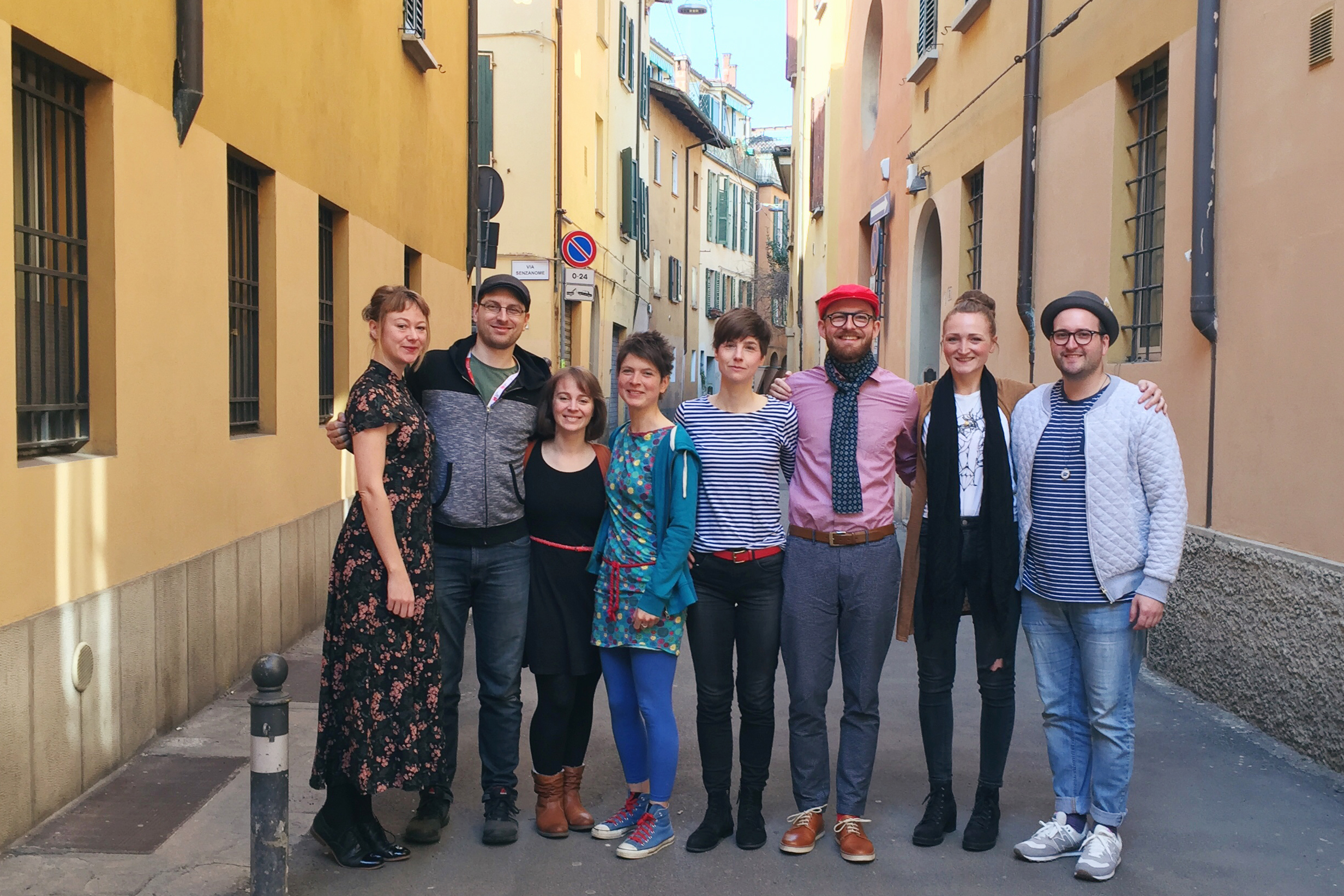 Und es ist wieder unterwegs und verbreitet gute Laune! Wie schon im vergangenen Jahr, aber in neuer Formation – das Familienzimmer. Diesmal aus dem oben erwähnten guten Grund ohne Joëlle Tourlonias … Um den Trennungsschmerz ein wenig zu kompensieren, haben Alexandra Helm, Judith Allert (die einzige Autorin im Ensemble), Markus Lefrançois und Robert Scheffner die Adresse gewechselt und vier weitere Kollegen in die WG aufgenommen: Annemone Kloos, Stefanie Reich, Franziska Walther und Marek Bláha. Obwohl sich nicht alle vorher persönlich kannten, habe auch das neue Familienzimmer super funktioniert, versichern alle; Post an Joëlle ist unterwegs. So feiert man Bologna richtig.