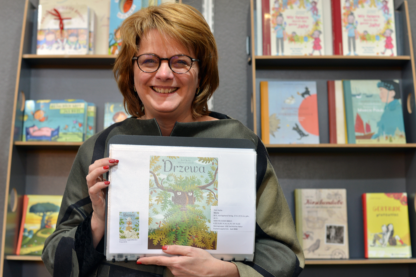 Daniela Filthaut mit dem polnischen Cover von Piotr Sochas Bäume-Buch – für das noch einige Blätter fehlen