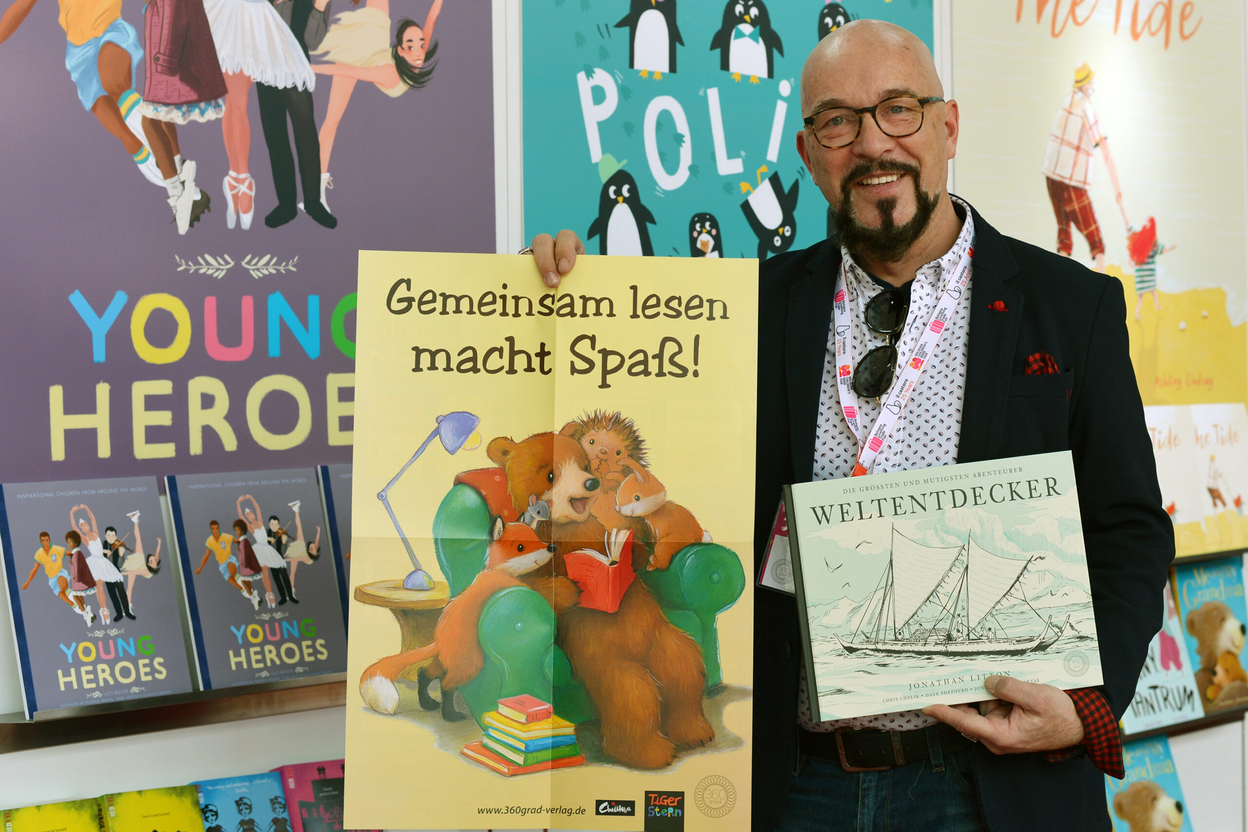 Mit seinem neu gestarteten 360 Grad Verlag möchte Harald Kiesel bis Jahresende etwa 60 Titel lieferbar haben. Ein Großteil davon sind Lizenzen aus dem Little Tiger Verlag, für den Herbst sind aber auch Eigenproduktionen geplant, wie ein Bilderbuch von Michael Engler und Henning Löhlein. Im Sachbuch wird Der Mond ein Highlight, eine facettenreiche Betrachtung des Mondes von Hannah Pang und Thomas Hegbrook.