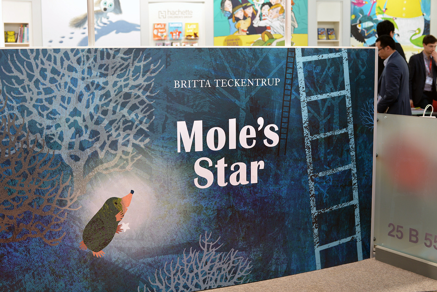Das Thema Mobbing hat auch Britta Teckentrup bearbeitet, auf die ihr ganz eigene Art. Die Schule lautet der Arbeitstitel ihres neuen Werks bei Jacoby & Stuart. Die Illustratorin und Autorin war wieder auf der Messe unterwegs und konnte zum Beispiel bei Hachette eine große Wand mit ihrer Illustration betrachten. Viele ihrer Bilderbücher erreichen das deutsche Publikum als Lizenzen, so auch Die kleine Maus und die große Mauer, im Herbst bei arsEdition. Für Das Ei (Prestel) konnte sie eine lobende Erwähnung bei den Bologna Ragazzi Awards einheimsen.