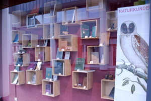 Mit großen Augen schaut eine kunstvoll und detailreich gezeichnete Eule ihr Gegenüber an. Sie verweist auf die Reihe „Naturkunden“, die seit 2013 im Verlag Matthes & Seitz erscheint und von Judith Schalansky herausgegeben wird. Das großformatige Plakat erweckt Aufmerksamkeit. Den „Naturkunden“ ist ein ganzes Schaufenster der Buchhandlung Bergen erlesen gewidmet. Einladend stehen zwei Stühle und ein runder Tisch vor dem Ladenlokal, die Tür ist an diesem sonnigen Vorfrühlingstag weit geöffnet.