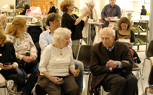 Nach den vorgetragenen Passagen aus dem Buch, zu denen Illustrationen aus der Graphic Novel auf der Leinwand gezeigt wurden, kam Pierre Radvanyi auf die Bühne. Er erzählte ein traurige und eine fröhliche Szene, die er mit seiner Mutter erlebt hatte. Ihm wurde mit viel Beifall gedankt.