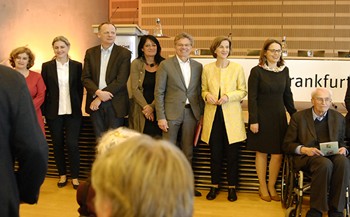 Am Nachmittag kam einem kleinen Wegstück zwischen Adickesallee und Feldgerichtstraße, gleich gegenüber der Deutschen Nationalbibliothek, besondere Bedeutung zu. Sabine Baumann, Vorsitzende des Vereins Frankfurt liest ein Buch, Lothar Ruske, Organisator des Lesefestes, Vertreter der Frankfurt School of Finance & Management, der Anna-Seghers-Gesellschaft Berlin und Mainz, des Aufbau Verlags, in dem die neue Ausgabe von Das siebte Kreuz erschienen ist, und Ortsbeiräte hatten sich zur Enthüllung des Namensschildes Anna-Seghers-Pfad eingefunden.