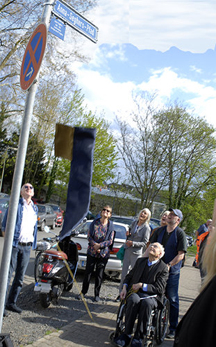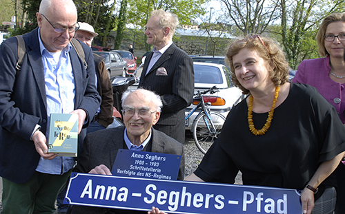 Pierre Radvanyi persönlich entfernte die Abdeckung vom Straßenschild. Vorher äußerte er: „Meine Großmutter war Frankfurterin gewesen, sie ist 1942 deportiert und ermordet worden. Wir, meine Schwester Ruth, meine Eltern und ich, waren da inzwischen in Mexiko gelandet. Meine Mutter hatte mich dort sofort am französischen Gymnasium angemeldet, an dem ich auch das Abitur ablegte.“ Weiter erzählte Pierre Radvanyi, dass der Botschafter aus Paris nach Mexiko gekommen sei und allen Abiturienten an französischen Gymnasien ein Studium in Frankreich angeboten habe. „Das wollte ich und sprach mit meiner Mutter.“ Anna Seghers verstand ihren Sohn, entgegnete jedoch, dass sie nach dem Krieg zurück nach Deutschland müsse, denn eine Schriftstellerin könne nicht lange ohne die Muttersprache arbeiten. Also lebte Anna Seghers seit 1947 wieder in Berlin, ihr Sohn studierte Physik in Paris.