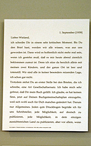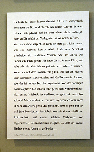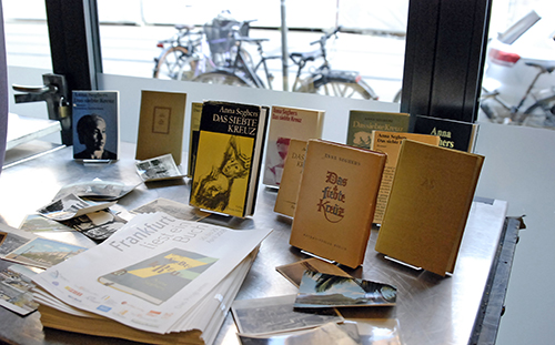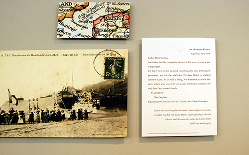 Die Exposition beginnt mit einem Brief von Netty Reiling an ihren späteren Mann Laszlo Radvanyi, damals studierten beide in Heidelberg. Dann sind Fotografien von Anna Seghers auf dem Schriftstellerkongress 1935 in Paris, aufgenommen von Giselle Freund, zu sehen. An der Wand werden einzelne Stationen ihres Lebens nachgezeichnet, in Postkarten, Landkartenausschnitten, Briefen. Die kleine Schau endet mit einer Auflistung von Werken der Schriftstellerin, die ab 1946 vor allem im Aufbau Verlag veröffentlicht wurden.