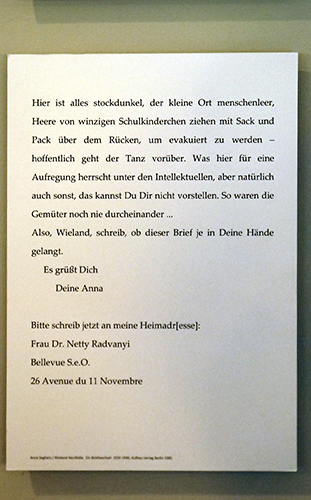 Vorgestern Abend wurde in Frankfurt im Fenster zur Stadt am Restaurant Margarete die Ausstellung „… so kann ich jetzt gar nichts sagen, was aus meinem Roman wird“ eröffnet. Die Zeile stammt aus einem von Brief Anna Seghers an Wieland Herzfelde vom 1. September 1939 aus dem Exil in Bellevue-Meudon bei Paris.