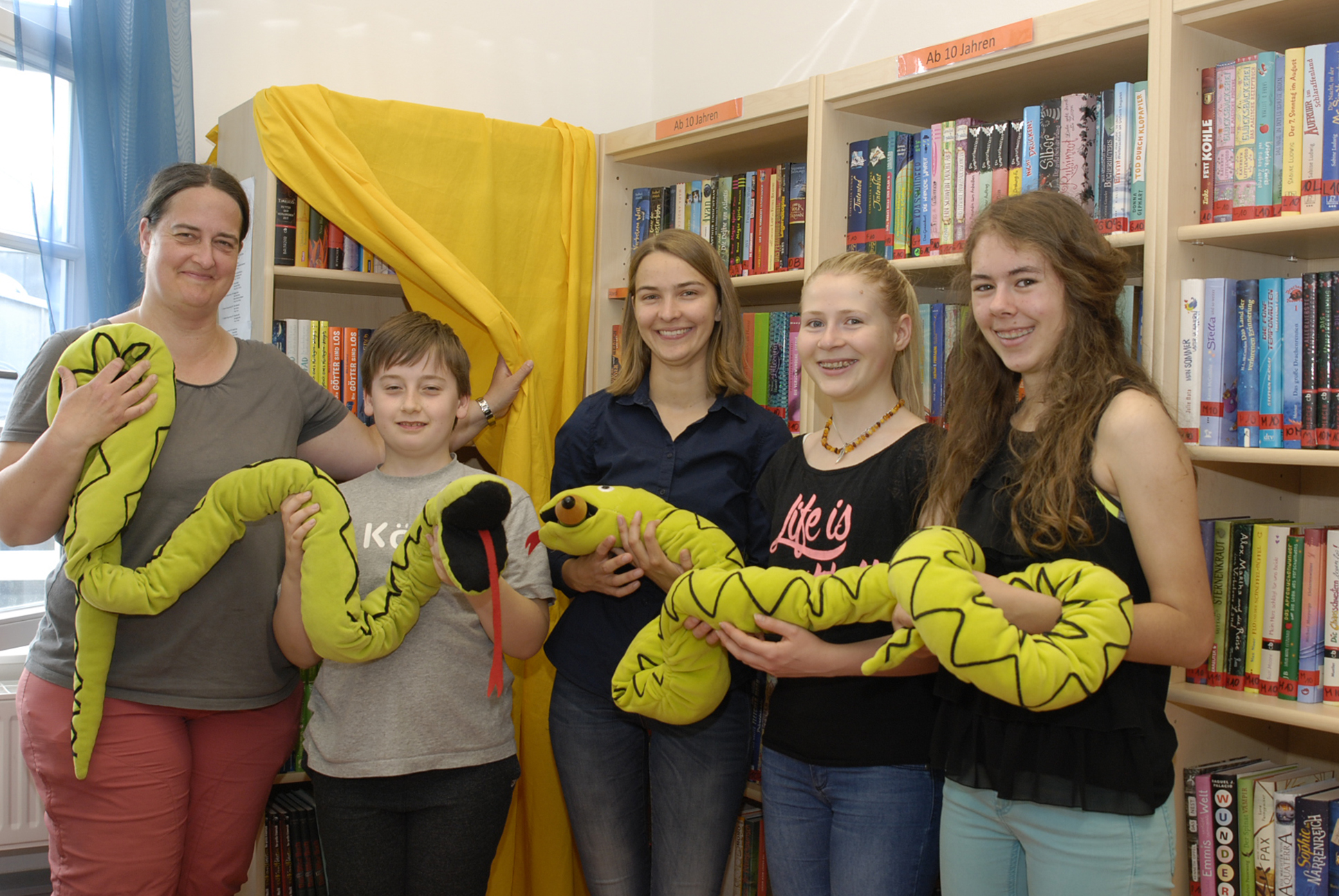 Gestern wurde das Geheimnis gelüftet: Das Novitäten-Regal in der Kinderbücherei Frankfurt-Kalbach, bis dato mit einem Vorhang versehen und von der Klapperschlange bewacht, wurde nun freigegeben.