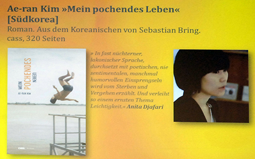 Anita Djafari gab als nächste Jurorin einen Einblick in Mein pochendes Leben von Ae-ran Kim, ebenfalls aus Südkorea. Die Übersetzung besorgte Sebastian Bring, das Buch kam im cass verlag Löhne heraus. Im Zentrum steht Arum, der 16-Jährige leidet an Progerie, der seltenen Krankheit des vorzeitigen Alterns. Er wird sterben. Seine Eltern waren 16, als er auf die Welt kam, sind jetzt 32 – der Junge ist etwa 80. Bittoun liest einen Ausschnitt, in dem sich das Kind im Bauch der Mutter Gedanken macht.