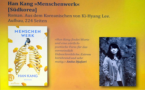 Um Menschenwerk von Han Kang, Südkorea, ging es anschließen. Die deutsche Übersetzung übernahm Ki-Hyang Lee, die Publikation der Aufbau Verlag Berlin. Mit Die Vegetarierin, ihrem Debütroman, erhielt Lee zusammen mit ihrer Übersetzerin ins Englische, Deborah Smith, 2016 den Man Booker International Prize. In Menschenwerk thematisiert sie den Gwangju-Aufstand 1980. Die Revolte richtete sich gegen Militärdiktatur und Kriegsrecht und wurde mit einem Massaker beendet. „Es ist keine leichte Lektüre“, sagte Jurorin Katharina Borchardt. Stéphane Bittoun las eine Passage, in der ein Geist losgelöst von seinem toten Körper über diesem schwebt und ihn beobachtet. Die Geschichte wird in verschiedenen Jahren wieder aufgenommen. 30 Jahre nach Zerschlagung des Aufstandes wird ein ernüchterndes Fazit gezogen: Es hat sich kaum etwas geändert. Der Roman erzählt von Gewalt und ihren Folgen. „Es geht um nachhaltige Verletzungen von Körper und Geist“, sagte Borchardt.