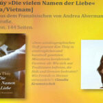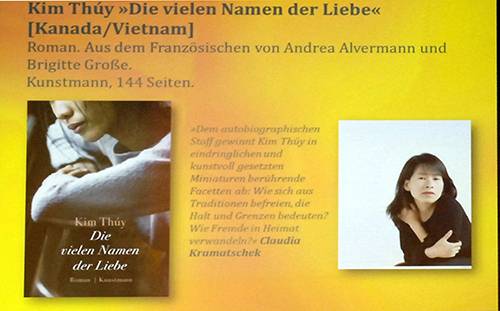 Ruthard Stäblein beschloss mit einem Plädoyer für Die vielen Namen der Liebe von Kim Thúy, die in Kanada und Vietnam zuhause ist, die Runde. Andrea Alvermann und Brigitte Große übertrugen die zusammenhängenden Erzählungen ins Deutsche, der Roman erschien im Verlag Antje Kunstmann München. „Auf meiner Reise durch Vietnam war ich gleichermaßen fasziniert von Hanoi und abgeschreckt von politischen Maßnahmen. Diese Ambivalenz der Gefühle ist auch im Buch enthalten“, äußerte der Juror. Liebesgeschichten werden mit Flucht und Ausflügen in die vietnamesische Kochkunst verknüpft. „Es ist ein Kaleidoskop von östlichen und westlichen Erzählmustern“, bemerkte der Juror.