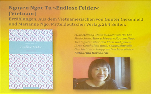 Über „14 herzzerreißende Erzählungen“ sprach Katharina Borchardt und meinte damit Endlose Felder von Nguyen Ngoh Tu aus Vietnam. Günter Giesenfeld und Marianne Ngo vollbrachten eine „übersetzerische Meisterleistung“, das Buch erschien im Mitteldeutschen Verlag Halle.