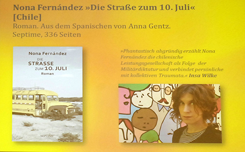 Die Vorstellungsrunde begann mit Weltempfänger-Jurymitglied Thomas Wörtche. Er plädierte für Nona Fernández aus Chile und ihren Roman Die Straße zum 10. Juli, übersetzt von Anna Gentz und erschienen im Septime Verlag Wien. Es ist ihr dritter ins Deutsche übersetzter Roman. „Es geht um den Diskurs über politische Relevanz von Literatur mit tragfähigen ästhetischen Konzepten. Dafür ist Die Straße zum 10. Juli ein gutes Beispiel. Das Buch ist ein szenisch angelegter politischer Krimi, später kommen phantastische Elemente ins Spiel. Vergangenheit und Gegenwart amalgamieren“, urteilte Wörtche. Es sei eine zwar komplexe, aber nicht schwierig zu lesende Geschichte.