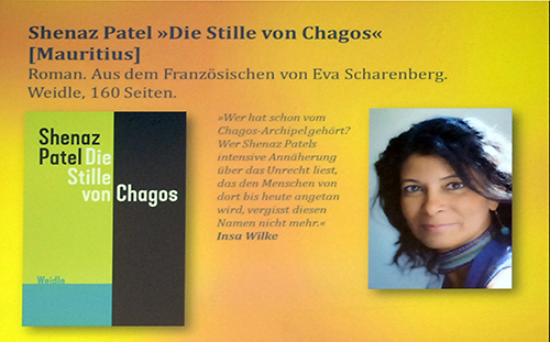 Jurorin Insa Wilke sprach über das nächste Buch: Die Stille von Chagos von Shenaz Patel aus Mauritius. Eva Scharenberg übersetzte den im Weidle Verlag Bonn publizierten Roman. Im Fokus steht das Unrecht auf dem Chagos-Archipel, der zum britischen Territorium gehört und in den 1960er Jahren für 50 Jahre an die USA verpachtet wurde. Die USA errichteten eine Militärbasis und siedelten die Inselbewohner zwangsweise um. „Chargos war Teil des Preises für die Unabhängigkeit von Mauritius 1968“, äußerte Wilke.
