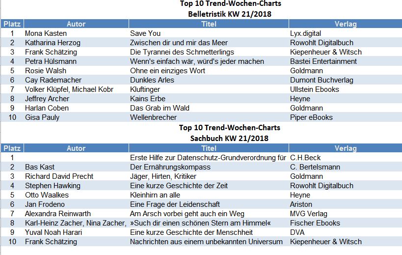 Die Top 10 ebook Trend Charts in Belletristik und Sachbuch werden wöchentlich durch media control GmbH ermittelt und in den eBook-Shops zur Verfügung gestellt: