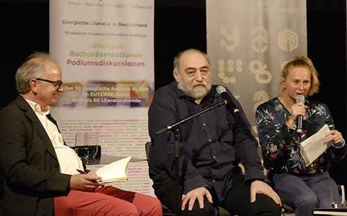 Dann las Jochen Nix aus Reise nach Karabach. „Es ist eines meiner Lieblingsbücher“, sagte Morchiladze anschließend. Das Buch habe seine eigene Geschichte, spiele in einer Region, in der Bürgerkrieg und Chaos herrschen und waghalsige Ideen, schnell zu Reichtum zu kommen, beinahe gelingen könnten. Es sei eigentlich kein politischer Roman. Die Titelfindung war für den Autor verblüffend einfach: „Es gab mal einen Film, der hieß Die Reise nach Sopot, der hat mir gut gefallen. Also habe ich mein Buch so ähnlich genannt.“ Die Reise nach Sopot war übrigens der Diplomfilm der georgischen Drehbuchautorin und Filmregisseurin Nana Dschordschadse, die 1948 in Tbilisi geboren wurde. Der Film war in der Sowjetunion viele Jahre lang verboten. Inzwischen ist Dschordschadse Mitglied der Academy of Motion Picture Arts and Sciences (AMPAS), die jedes Jahr die Oscars vergibt.