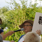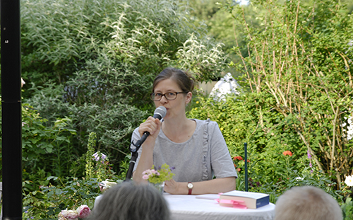 Brombach las anschließend aus den Reden im Festzelt und stellte ihr Medley unter die Überschrift Über den Sinn des Erinnerns. Sie zitierte Nicolas Born, Marianne Leuzinger-Bohleber, Peter Härtling, Roger Willemsen, Galsan Tschinag, Katja Langen-Müller und Wolfgang Hilbig.