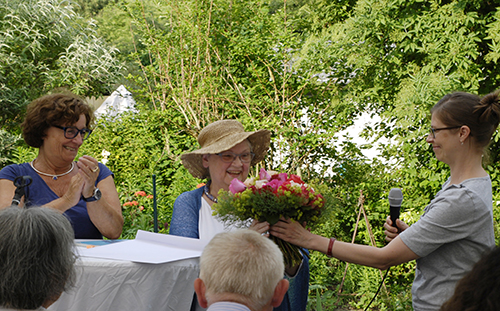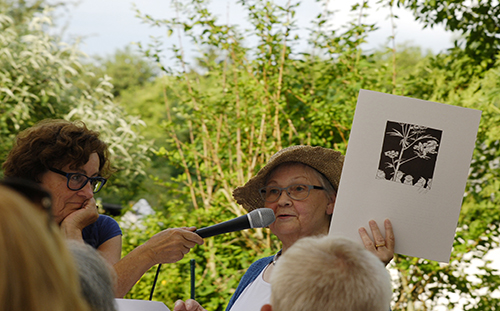 Ein weiteres Jubiläum war zu begehen: Nach 40 Jahren Begleitung der Stadtschreiber und nach 23 Jahren Mitgliedschaft in der Stadtschreiber-Jury als Bürgerjurorin schied Monika Steinkopf aus diesem Gremium aus. Viel gab es aus dieser Zeit zu erzählen, Steinkopf wusste noch, wie alles begann: „Ich telefonierte im Frühsommer 1978 mit Franz Joseph Schneider, 1974 Initiator des Stadtschreiberpreises. Er lud mich gleich für den nächsten Tag ein. Die Stadtschreibernamen wurden immer sehr geheim gehalten, Schneider sagte nur: ‚The star is born.’ Der Stadtschreiber 1978/79 war Nicolas Born.“ 1978 richtete Steinkopf ihre Berger Bücherstube ein, die sie 36 Jahre lang führte. „Der Festredner bei Borns Amtsübernahme war Martin Walser. Er sagte damals, er würde sich nicht mit der Teilung Deutschlands abfinden. Das klang in jenen Jahren sehr seltsam.“ Die langjährige Buchhändlerin erinnerte sich auch an den Riesenkerbel im Schneiderschen Vorgarten. Franz Joseph Schneider mochte ihn, den Nachbarn war er verhasst, weil er überall seine Samen hinterließ und so viele weitere Riesenkerbel hervorbrachte, die störten. Zum 25. Stadtschreiberjubiläum und zum 20-jährigen Bestehen der Buchhandlung 1998 überreichte Jörg Steiner zum Abschluss seines Stadtschreiberjahres Monika Steinkopf einen besonderen Text für ihre Stadtschreiber von Bergen – Poetischen Blätter. Robert Gernhardt lieferte die Zeichnung dazu – den Riesenkerbel mit fröhlichen und ärgerlichen Leuten darunter und einem lustigen Musikanten im Geäst. „Der Riesenkerbel kam von meiner Tante, er hielt uns lange auf Trab“, ergänzte Adrienne Schneider.