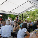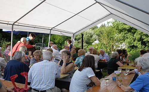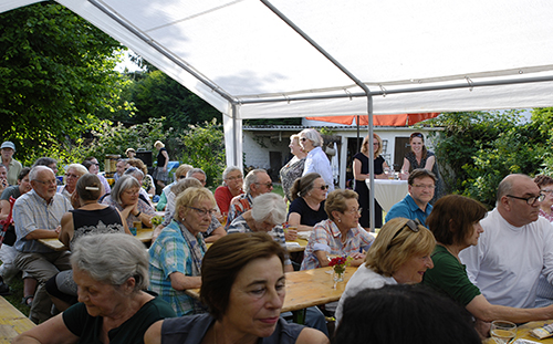 „So etwas gab es noch nie – obwohl hier schon viel gefeiert wurde“, begrüßte Adrienne Schneider die vielen Gäste. Sie bedankte sich bei den Helfern Julia und Petra Scheschonka, bei Cornelia Grebe, Mitgeschäftsführerin der Kulturgesellschaft, bei der Buchhändlerin Anna Doepfner, beim Grillmeister Ulrich Sonnenschein und bei der Feuerwehr für die Bereitstellung der Apfelweintische und -bänke.