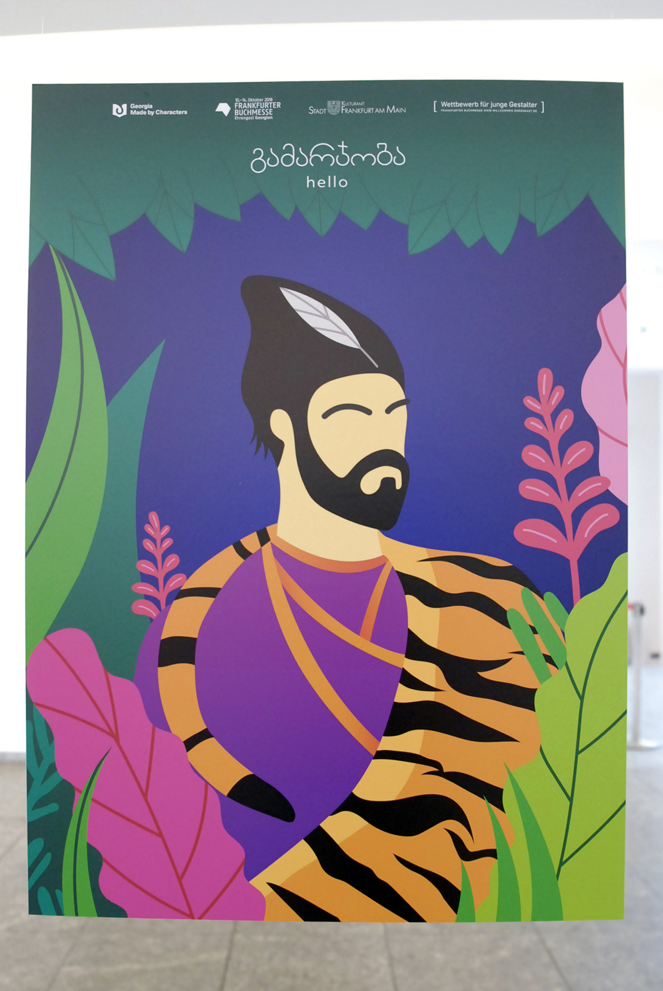 Das besondere georgische Alphabet, seit 2016 UNESCO Weltkulturerbe, wird von vielen Gestaltern in ihren Arbeiten aufgenommen. Auch Lisa Schmidtke, Fachhochschule Potsdam, hat damit gespielt und georgische Schriftzeichen in ihren Entwurf eingefügt. „Es gibt in der Hauptstadt Tbilisi eine monumentale Frauenstatue mit einer Weinschale und einem Schwert in der Hand. Das Schwert habe ich durch Bücher ersetzt“, erklärte Schmidtke.