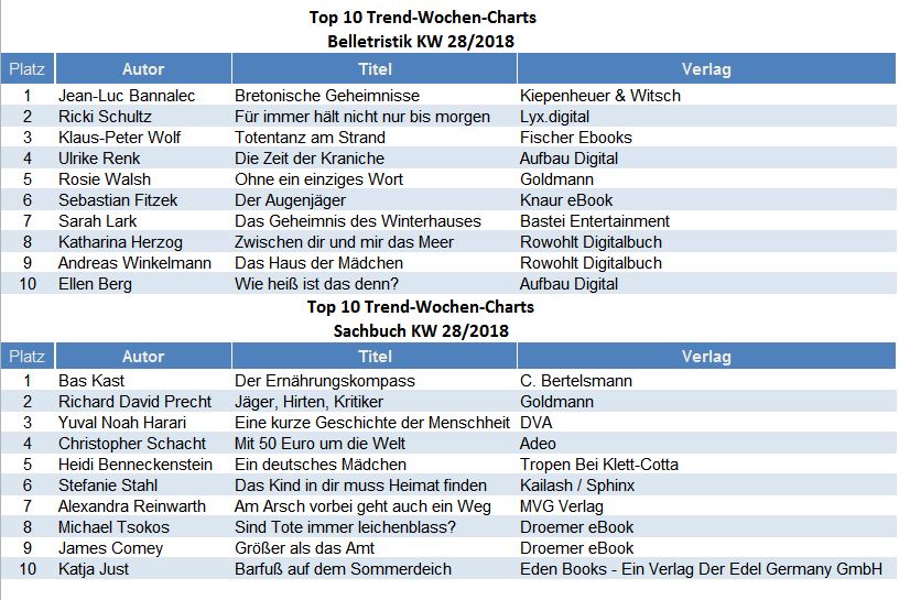 Die Top 10 ebook Trend Charts in Belletristik und Sachbuch werden wöchentlich durch media control GmbH ermittelt und in den eBook-Shops zur Verfügung gestellt: