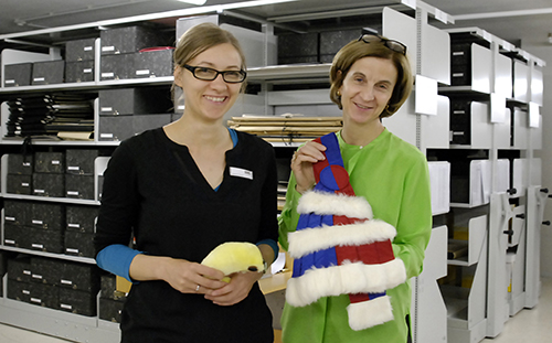 Stephanie Preuss (l.) mit einem ungefährlichen Bücherwurm aus Plüsch, Sylvia Asmus mit einer Schärpe
