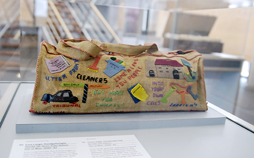 Ein besonderes Objekt ist die handgenähte Tasche von Irma Lange für ihren Sohn Hanns. Die Stickereien und Aufnäher zeigen den Weg von der Verhaftung Irma Langes im September 1940 in der Nähe von London bis zur Internierung auf der Isle of Man, die sie im Juli 1942 wieder verlassen konnte. Irma Lange emigrierte aufgrund ihrer jüdischen Abstammung 1939 mit ihrem Sohn nach Großbritannien, überstand das Exil und blieb in London. „Besonders die Ecken der Tasche wiesen starke Gebrauchsspuren auf. Die Restaurierung, bei der wir die Ecken von innen mit Spezialpapier sicherten, war eine Herausforderung“, erzählte Preuss.