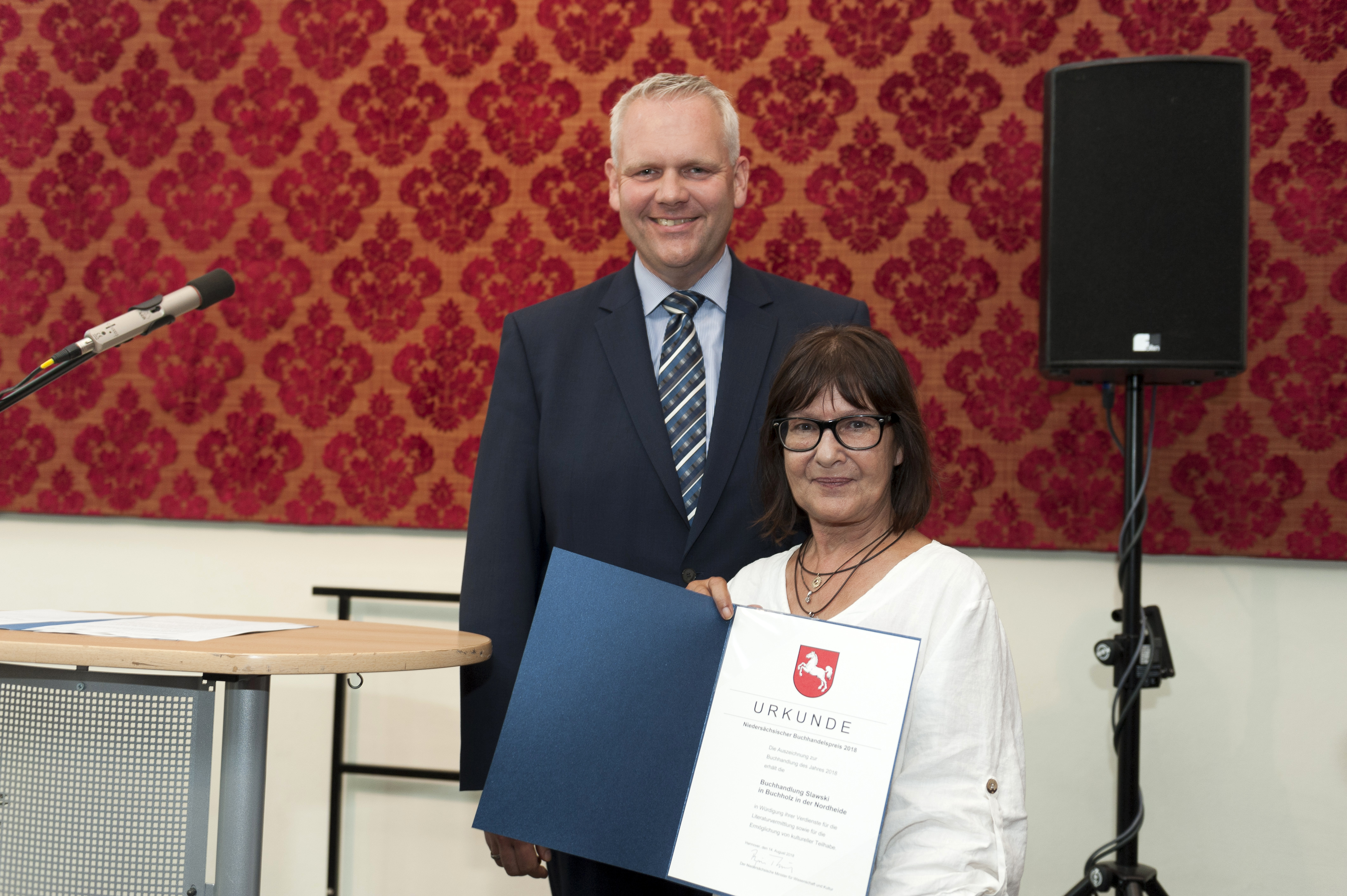 „Buchhändlerinnen und Buchhändler verkaufen längst nicht mehr nur Bücher. Mit zahlreichen literarischen Veranstaltungen für Kinder, Jugendliche und Erwachsene sind sie zugleich wichtige Kulturvermittler in ihrer jeweiligen Region“ – Als Anerkennung für dieses Engagement in der Lese- und Literaturförderung zeichnet das Niedersächsische Ministerium für Wissenschaft und Kultur (MWK) jährlich eine „besonders herausragende“ Buchhandlung mit dem Niedersächsischen Buchhandelspreis aus. In diesem Jahr ging der Preis an die Buchhandlung Slawski in Buchholz in der Nordheide und ihre Inhaberin Monika Külper. Der Preis ist mit 5.000 Euro dotiert und wird in Zusammenarbeit mit dem Börsenverein des Deutschen Buchhandels Landesverband Nord e.V. vergeben.