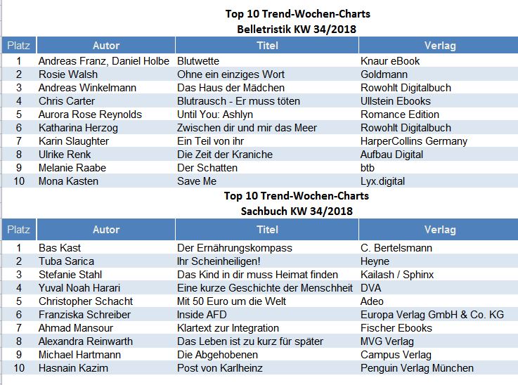 Die Top 10 ebook Trend Charts in Belletristik und Sachbuch werden wöchentlich durch media control GmbH ermittelt und in den eBook-Shops zur Verfügung gestellt: