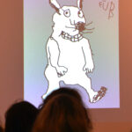 Nadia Buddes Beitrag stand unter der Überschrift „Mit dem linken Fuße gemalt“, und das war wörtlich gemeint. Die Illustratorin zeigte Bilder, die sie mal mit dem linken, mal mit dem rechten Fuß gemalt hat, um eine neue Technik auszuprobieren und sich nicht in der alten festzufahren. Mit der Zeit jedoch hätten sich die Fußzeichnungen den Handzeichnungen immer mehr angenähert, wobei die Füße wohl mutiger seien als die Hände, denn sie hätten auch Farbe verwendet – die setzt Nadia Budde ansonsten erst am Computer ein, um ihre Schwarz-Weiß-Zeichnungen zu kolorieren. Für sie sei es das innere Wesen, das den Stil hervorbringe, sofern es gelinge, einen Zugang dazu zu finden und es freizulassen.