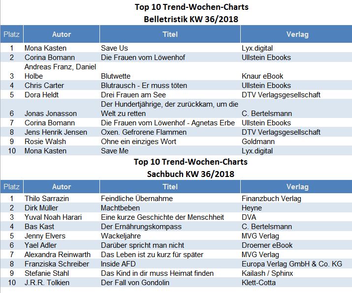 Die Top 10 ebook Trend Charts in Belletristik und Sachbuch werden wöchentlich durch media control GmbH ermittelt und in den eBook-Shops zur Verfügung gestellt: