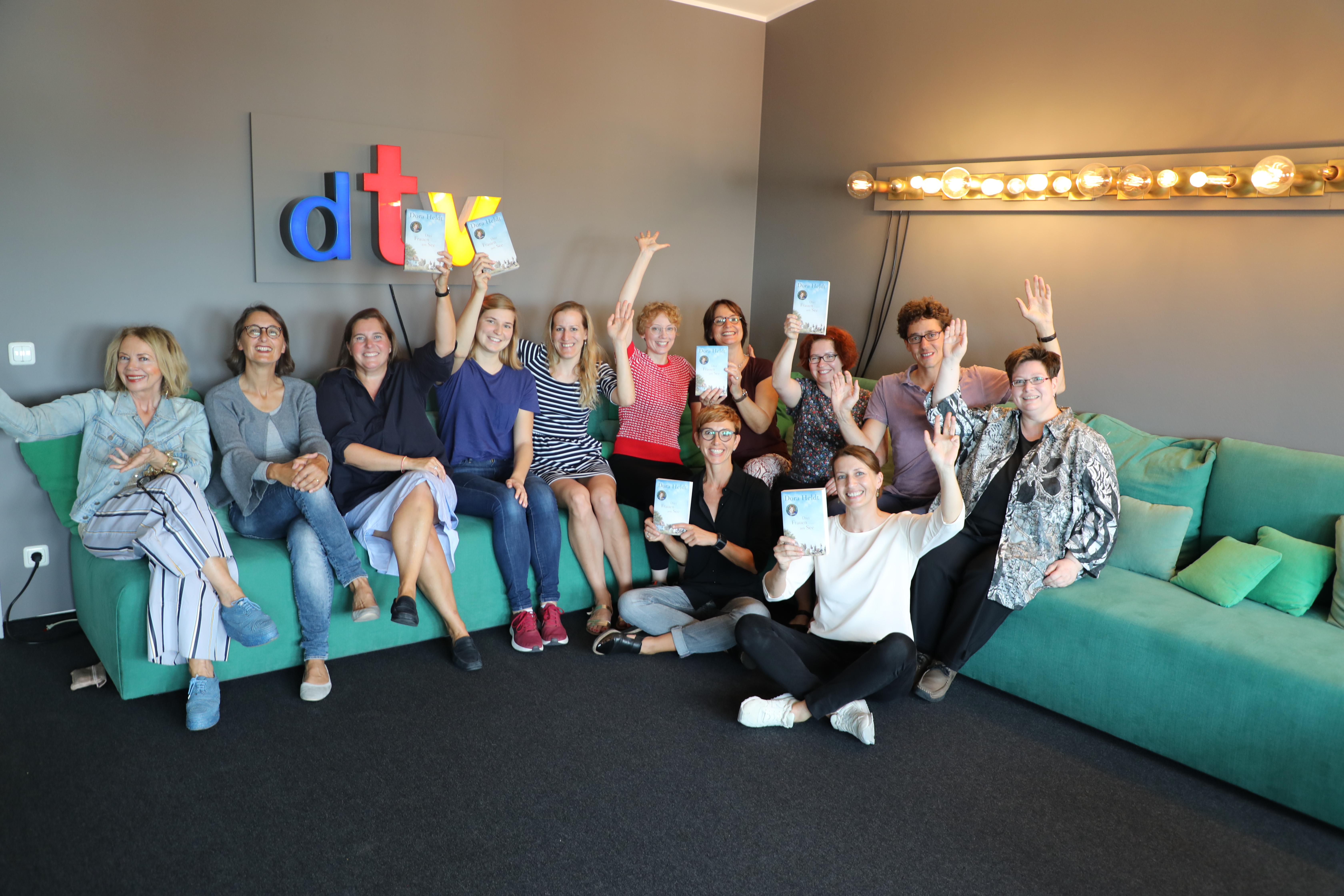 Diese Freude steckt an: Das Team um Verlegerin Claudia Baumhöver bei dtv freut sich über Platz 1 von Dora Heldts neuem Roman Drei Frauen am See auf der aktuellen Spiegel-Paperback-Bestsellerliste.