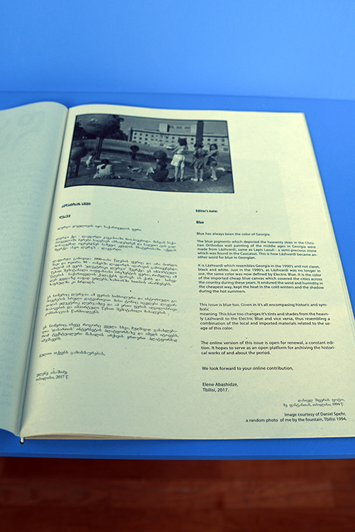 Ausgestellt ist auch die jüngste Ausgabe des 2011 von Elene Abashidze, Ana Chorgolashvili und Natuta Bagrationi gegründeten zweisprachigen Magazins Danarti. Das fünfte Heft, erschienen im Dezember 2017, hat den Titel Die 90er überleben. Es wird auf einem Tisch vor einer blauen Wand präsentiert, man kann darin blättern und lesen. „Blau war eine dominante Farbe in Tbilisi. Mit blauen Planen wurden baufällige Häuser abgedeckt, Fassaden, die gerade saniert werden, geschützt“, erklärte Mahret Kupka. Noch einmal kommt sie auf die ominöse Lara zurück. „Ich habe meinen Gesprächspartnern von diesem Zettel erzählt, und sie erzählten mir dann ihre Geschichten.“ Lara beschützte also nicht nur, sie half auch weiter.