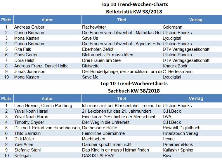 Die Top 10 ebook Trend Charts in Belletristik und Sachbuch werden wöchentlich durch media control GmbH ermittelt und in den eBook-Shops zur Verfügung gestellt: