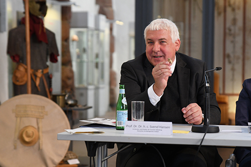 „Wein wurde in Georgien nachgewiesenermaßen sehr früh getrunken“, fügte Kurator Svend Hansen hinzu. Wilder Wein war und ist von Portugal bis Tadschikistan verbreitet. Neueste Forschungen lokalisieren das Zentrum der Domestikation von Wein in Ostanatolien und im Südkaukasus. Weinsäuren wurden in Gefäßen aus den Jahren 5800 bis 5400 vor Christus nachgewiesen. Eine große Weinkultur entstand in Georgien seit dem vierten Jahrtausend vor Christus, Zeugnisse dafür sind kunstvoll gestaltete Trink- und Aufbewahrungsgefäße. „Wein steht für Innovationen aus dem Gebiet Georgiens. Es gibt ein digitales Angebot dazu im Rahmen der Ausstellung. Manches wird den Teilnehmern nicht fremd vorkommen“, bemerkte Hansen.