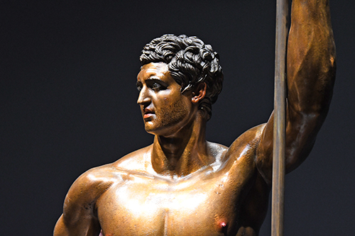 Außerdem verwies er auf einen besonderen Höhepunkt – die berühmten Bronzen vom Quirinal, 1885 aufgefunden. Die Deutung des sogenannten Thermenherrschers und des sogenannten Faustkämpfers ist umstritten. Ein aufwendiger Nachguss beider Statuen ist zu bewundern. Seit 35 Jahren beschäftigt sich das Liebieghaus mit Polychromie und gehört damit zu den weltweit führenden Instituten auf diesem Feld. Die Forschungsergebnisse untermauern, dass die Bronzen wohl zur Argonautensage gehören.