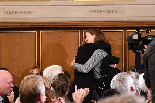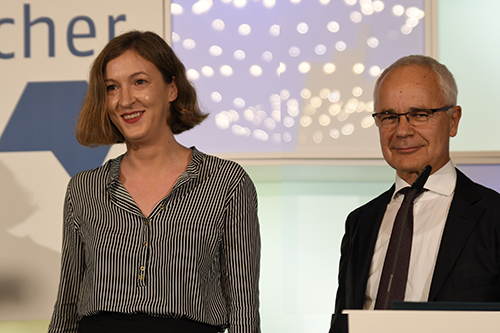 Heinrich Riethmüller gratulierte der Preisträgerin Inger-Maria Mahlke. Sie bedankte sich vor allem bei der gekündigten Rowohlt-Lektorin Barbara Laugwitz und erhielt für diese Worte viel Beifall.