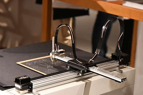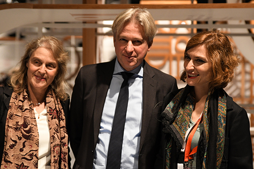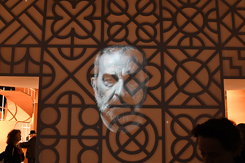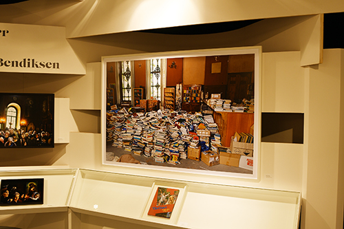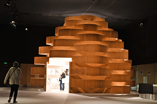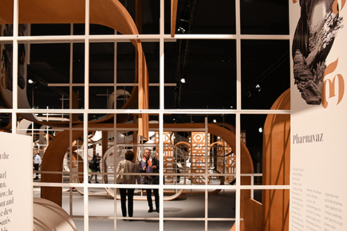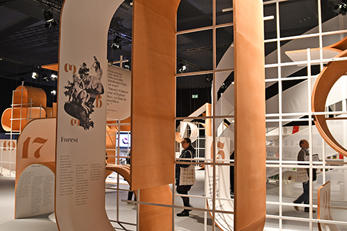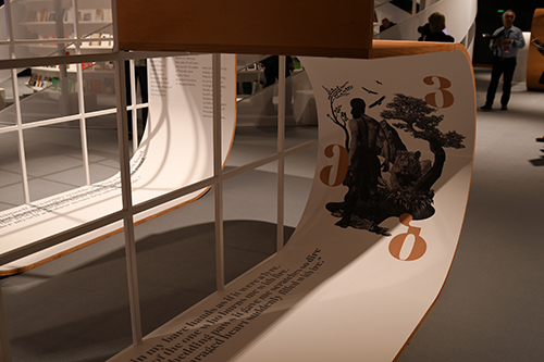 Medea Metreveli, Direktorin des Georgian National Book Center, und Gestalter George Bokhua führten durch den Pavillon, der verschiedene Stationen enthält: ein Café; den Hub of Reflections mit Fotos der Agentur Magnum von Tbilisi; den Hub of Emotions mit sich verändernden Gesichtern georgischer Gegenwartsautoren; eine Bühne mit großem Screen und eine kleinere Lesebühne; den Hub of Symbols mit der Möglichkeit, georgische Buchstaben auszudrucken; die Ausstellung Books on Georgia mit rund 600 internationalen Büchern über das Land, das auch Balkon Europas genannt wird.