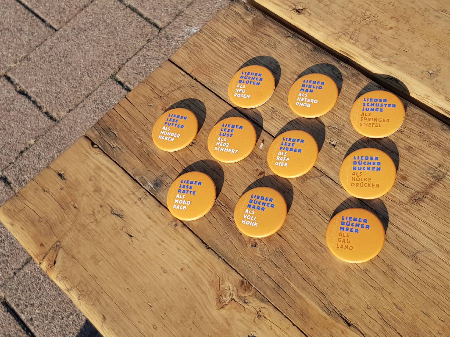 Dabei gibt es neben liebevollen Wortspielen zum Lesen und zur Liebe zum Buch auch Buttons, die sich mit den politischen Messethemen auseinandersetzen: ‚Lieber Bücher rücken als Höcke drücken‘ war der Spruch zum gestrigen Messebesuch des AfD-Manns.