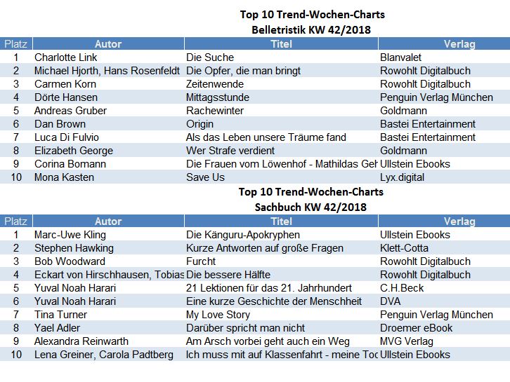 Die Top 10 ebook Trend Charts in Belletristik und Sachbuch werden wöchentlich durch media control GmbH ermittelt und in den eBook-Shops zur Verfügung gestellt: