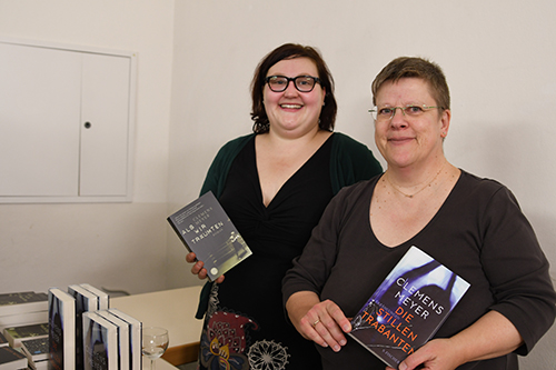 Der Abend war noch nicht ganz zu Ende; der 45. Stadtschreiber signierte Bücher, die am Stand von Bergen erlesen bei Anna Döpfner und Kathrin Diederichs zu erwerben waren.