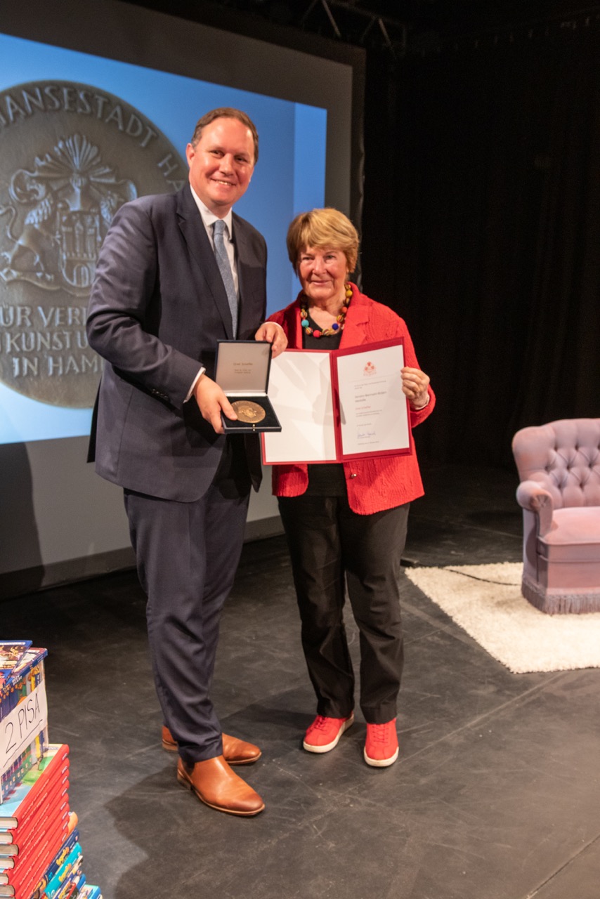 Der Senat der Freien und Hansestadt Hamburg würdigt die Kinderbuchautorin Ursel Scheffler für ihre Verdienste für die Leseförderung mit der Senator-Biermann-Ratjen-Medaille. Dr. Carsten Brosda, Senator für Kultur und Medien, überreichte die Medaille heute während einer Veranstaltung des Hamburger Lesefests Seiteneinsteiger im Fundus Theater, bei der Grundschülerinnen und Grundschüler Ursel Scheffler zum 80. Geburtstag gratulierten.