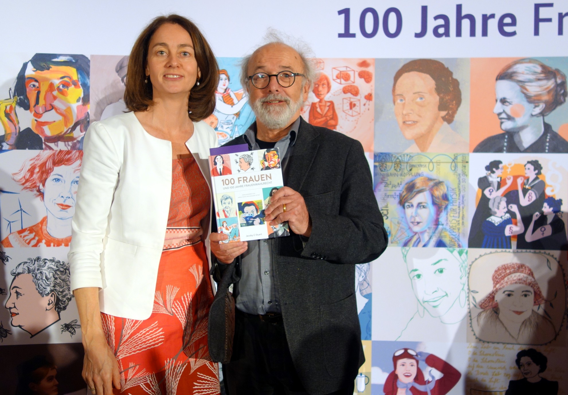 Gestern Abend eröffneten Bundesjustizministerin Katharina Barley und Verleger Edmund Jacoby die Ausstellung „100 Jahre Frauenwahlrecht“ im Bundesjustizministerium in Berlin Mitte. Gezeigt werden 75 Originalporträts aus dem Buch 100 Frauen und 100 Jahre Frauenwahlrecht, das die Illustratorinnen Sabine Kranz und Annegret Ritter jetzt im Berliner Verlagshaus Jacoby & Stuart herausgegeben haben.